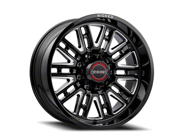 This 20x10 Wicked Offroad W937 Gloss Black Milled 8-Lug Wheel is completed in a high-quality gloss black finish with steel milled accents that will be the envy of everyone. For added protection and looks, there is a durable clear coat that can handle the rigors of daily driving.