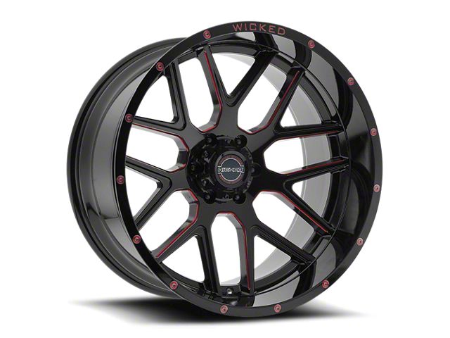 Gloss Black Milled Finish with Red Tint. This Wicked Extreme Off-road Wheel has a high quality, black finish that features milled accents for an impressive appearance. For added protection and good looks, this Wheel is completed in a durable, gloss, red tinted clear coat that is tough enough to stand up against the hazards of everyday driving - including road chips and pitting.