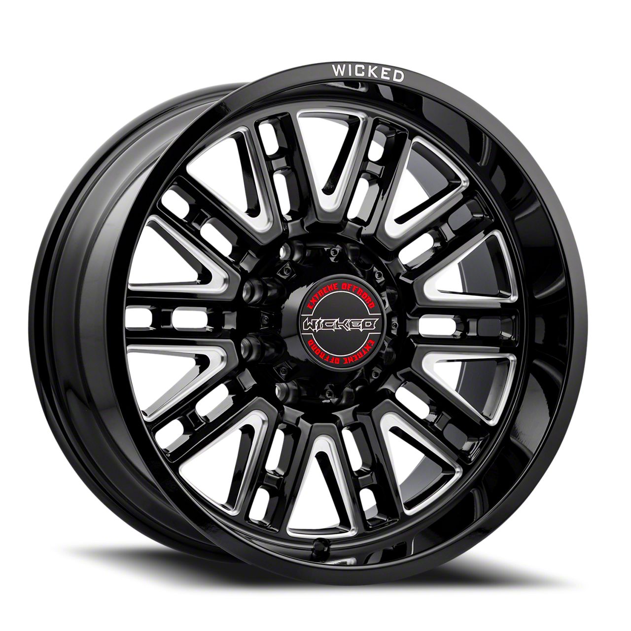 This 20x10 Wicked Offroad W937 Gloss Black Milled 8-Lug Wheel is completed in a high-quality gloss black finish with steel milled accents that will create a striking appearance. There's a durable clear coat that protects against driving hazards.