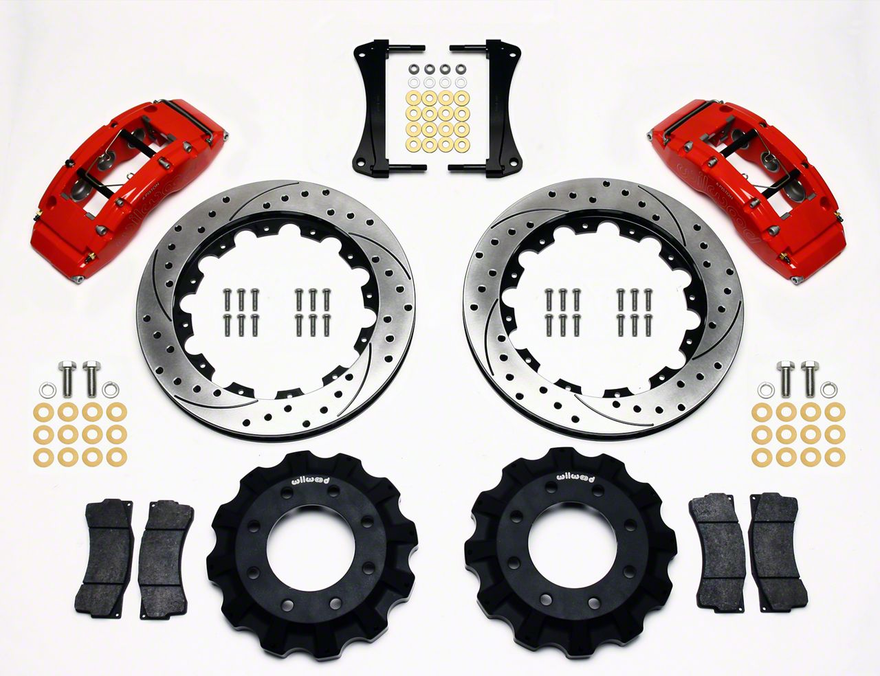 Has Everything You Need. This kit features (2) red calipers, (2) drilled and slotted rotors, (1) Smartpad brake pads set, and all the necessary installation hardware.