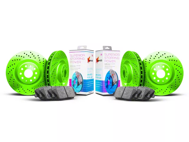 Construction and Appearance. Each rotor is crafted from G3000-grade high-carbon cast iron and features precision CNC-machined slots and radial chamfered drilled holes to improve heat dissipation—lowering temperatures by up to 200 degrees Fahrenheit. Finished in a bold metallic green with matching hats, these 8-lug rotors are paired with matte black Kevlar ceramic pads for quiet, clean operation. The entire kit is nano-coated and UV-resistant to stand up to the elements and long-term use.