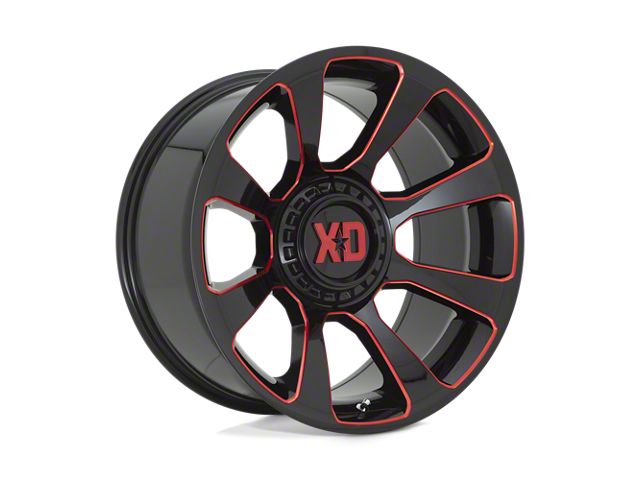 XD Reactor Gloss Black Milled with Red Tint 5-Lug Wheel; 20x9; 0mm Offset is a perfect blend of style and rugged design, making it a standout choice for those looking to enhance their vehicle's aesthetic appeal. Its bold, dark metallic finish pairs seamlessly with a wide variety of vehicle styles, offering both modernity and durability. Built by XD, this wheel is designed to elevate your vehicle's appearance with its robust presence.