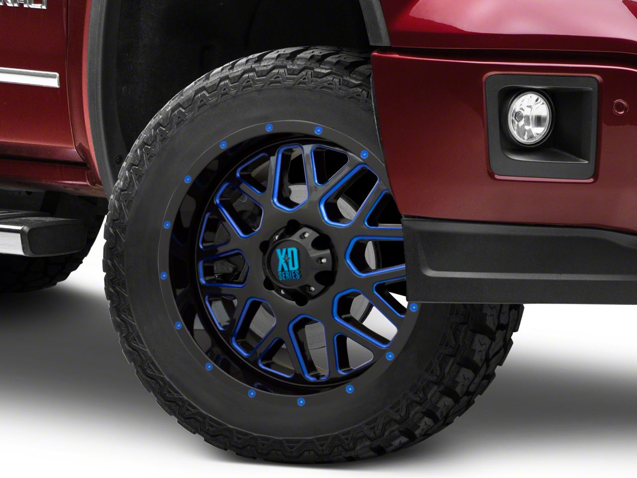 XD Grenade Satin Black Milled with Blue Clear Coat 6-Lug Wheel; 20x9; 18mm Offset exudes a sleek aesthetic appeal, complementing a range of vehicle styles. Its dark stainless finish emanates sophistication, while the brand reputation of XD ensures robustness. This wheel seamlessly merges elegance with durability.