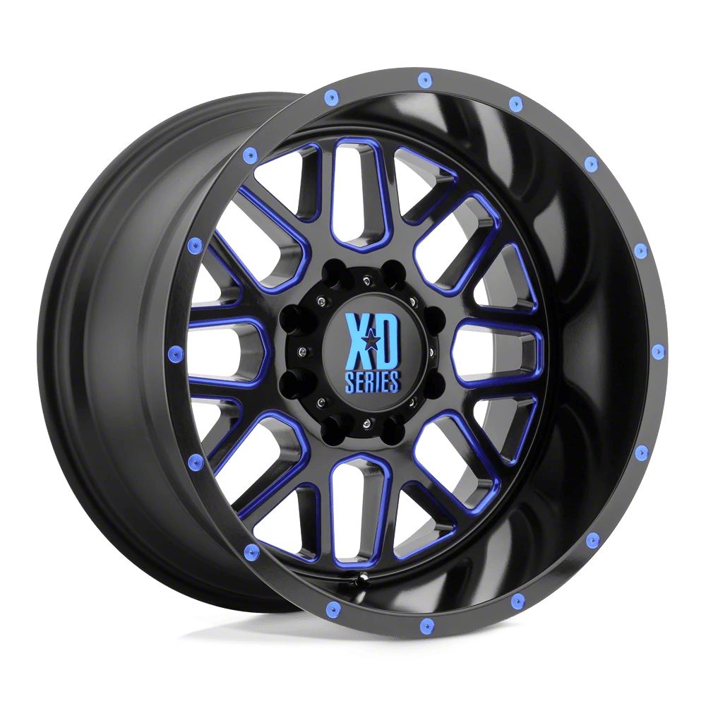 XD Grenade Satin Black Milled with Blue Clear Coat 8-Lug Wheel; 20x12; -44mm Offset The XD Grenade Satin Black Milled with Blue Clear Coat 8-Lug Wheel combines a sleek, sophisticated design with premium construction that enhances the visual appeal and complements a wide range of vehicle styles. This wheel is perfect for those seeking to make a bold statement while maintaining elegance and robustness.