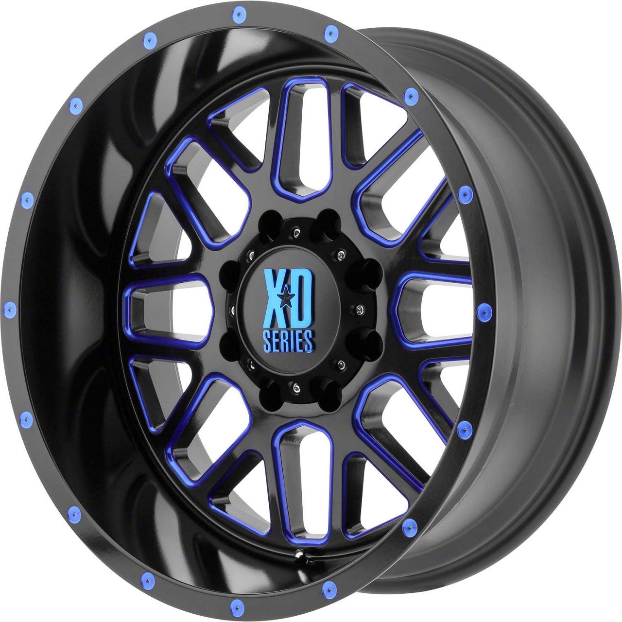 XD Grenade Satin Black Milled with Blue Clear Coat 8-Lug Wheel; 20x12; -44mm Offset offers a striking balance between style and durability. The design speaks to the brand's commitment to quality, enhancing the vehicle's appearance with its distinct look. This wheel, with its unique aesthetics, is ideal for drivers who appreciate a blend of modern design and robust functionality.