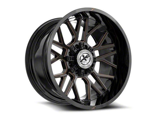 This 20x10 XF Offroad XF-235 Gloss Black and Bronze Milled 8-Lug Wheel; 20x10; -12mm Offset is completed in a high-quality gloss black finish with bronze milled accents to make your wheel the envy of everyone. For added looks and durability, the wheels has a durable clear coat that withstand the rigors of daily driving.