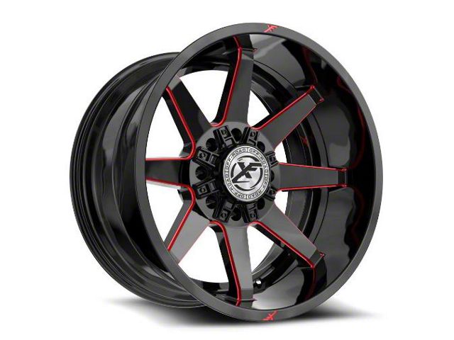 This 20x9 XF Offroad XF-236 Gloss Black and Red Milled 8-Lug Wheel; 20x9; 12mm Offset is completed in a high-quality gloss black finish with red accents to make your wheel the envy of everyone. For added looks and durability, the wheels has a durable clear coat that withstand the rigors of daily driving.