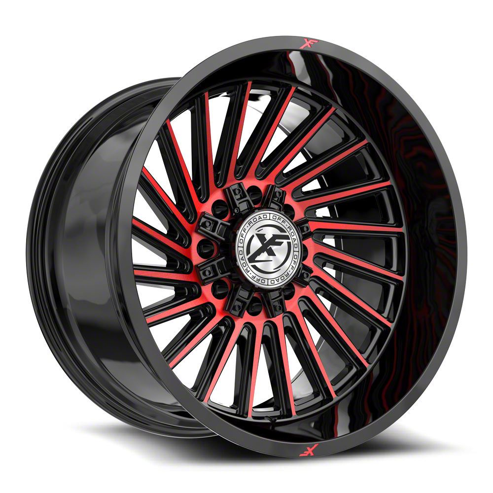 This 24x12 XF Offroad XF-239 Gloss Black and Red Machined 8-Lug Wheel; 24x12; -44mm Offset is completed in a high-quality gloss black finish with red accents to make your wheel the envy of everyone. For added looks and durability, the wheels has a durable clear coat that withstand the rigors of daily driving.
