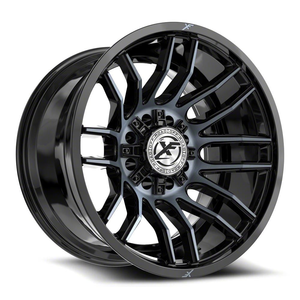 XF Offroad XF-232 Gloss Black and Machined Titanium Double Dark Tint 8-Lug Wheel; 20x10; -24mm Offset is a visually striking choice, offering a combination of rugged durability and modern styling. Its design complements off-road and sporty vehicles alike, enhancing the overall aesthetic appeal.