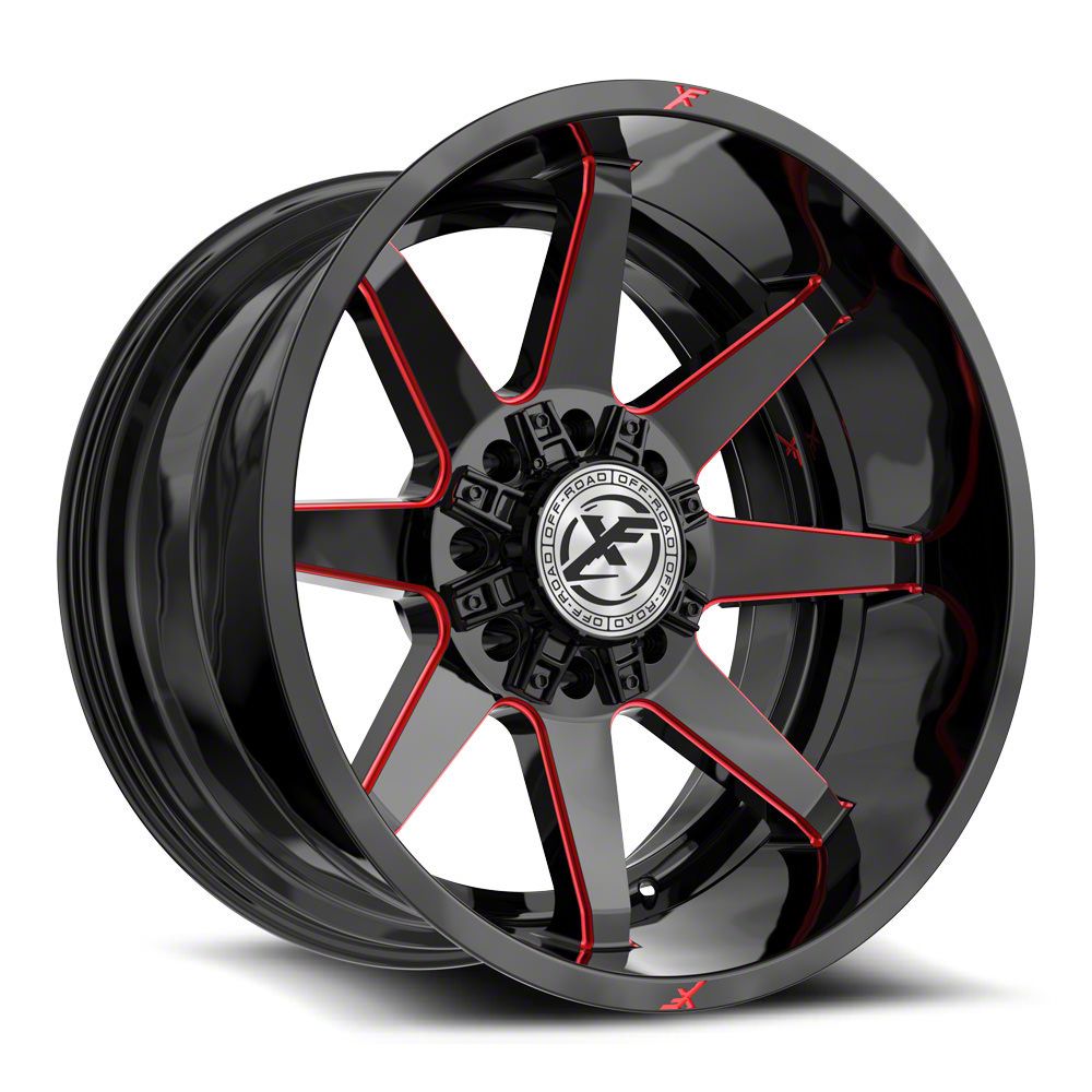 This 20x12 XF Offroad XF-236 Gloss Black and Red Milled 8-Lug Wheel; 20x12; -44mm Offset is completed in a high-quality gloss black finish with red accents to make your wheel the envy of everyone. For added looks and durability, the wheels has a durable clear coat that withstand the rigors of daily driving.