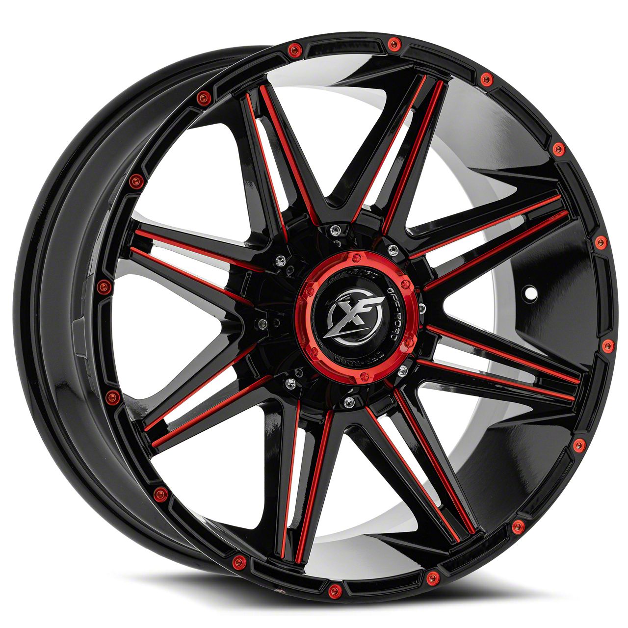 This 20x10 XF Offroad XF-220 Gloss Black and Red Milled 6-Lug Wheel; 20x10; -24mm Offset is completed in a high-quality gloss black finish with red accents to make your wheel the envy of everyone. For added looks and durability, the wheels has a durable clear coat that withstand the rigors of daily driving.