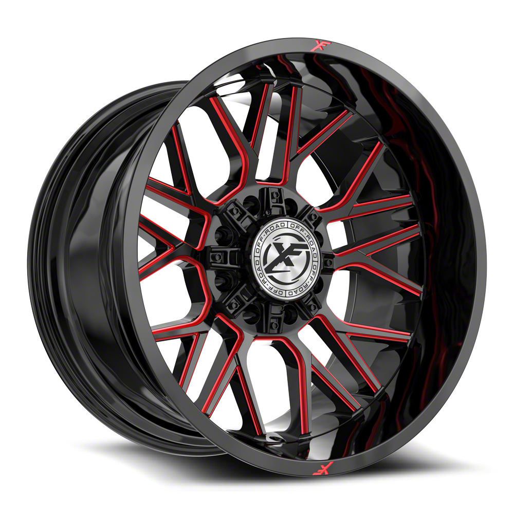 XF Offroad XF-235 Gloss Black and Red Milled 8-Lug Wheel; 20x10; -24mm Offset is a visually striking choice, offering a combination of rugged durability and modern styling. Its design complements off-road and sporty vehicles alike, enhancing the overall aesthetic appeal.