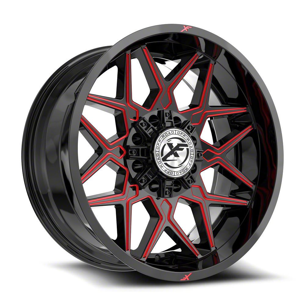 This 20x10 XF Offroad XF-238 Gloss Black and Red Milled 8-Lug Wheel; 20x10; -12mm Offset is completed in a high-quality gloss black finish with red accents to make your wheel the envy of everyone. For added looks and durability, the wheels has a durable clear coat that withstand the rigors of daily driving.