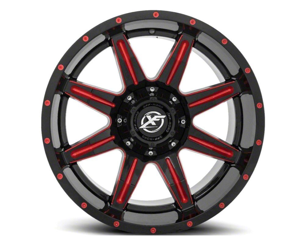 XF Offroad XF-215 Gloss Black Red Milled 6-Lug Wheel; 20x9; 12mm Offset exudes sophistication with its finish, offering a sleek and modern appeal to any vehicle it adorns. The design is meticulously crafted to enhance the aesthetic of your vehicle, giving it a distinctive and upscale look. Perfect for those seeking to elevate their vehicle's style, this wheel blends seamlessly with both contemporary and classic vehicle designs, making it a versatile choice for a wide range of vehicles. Its robust construction ensures durability, making it a reliable choice for drivers who value both style and quality.