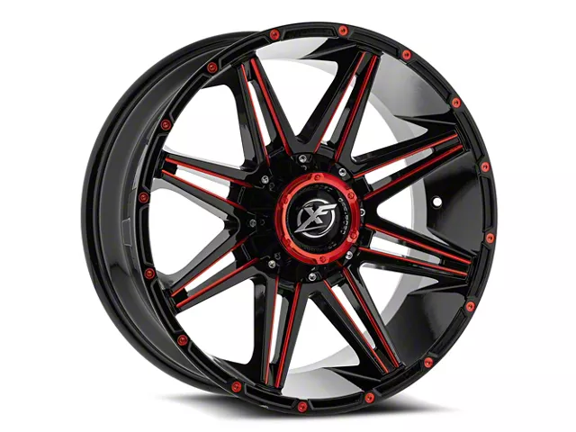 XF Offroad XF-220 Gloss Black and Red Milled 8-Lug Wheel; 20x9; 12mm Offset is a visually striking choice, offering a combination of rugged durability and modern styling. Its design complements off-road and sporty vehicles alike, enhancing the overall aesthetic appeal.
