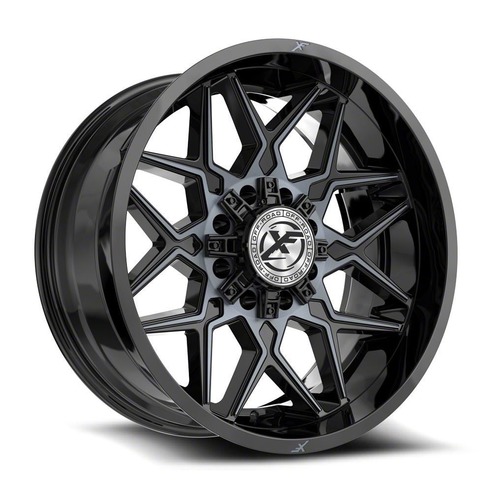 This 20x10 XF Offroad XF-238 Gloss Black and Machined Titanium Double Dark Tint 8-Lug Wheel; 20x10; -12mm Offset is completed in a high-quality gloss black finish with machined titanium double dark accents to make your wheel the envy of everyone. For added looks and durability, the wheels has a durable clear coat that withstand the rigors of daily driving.