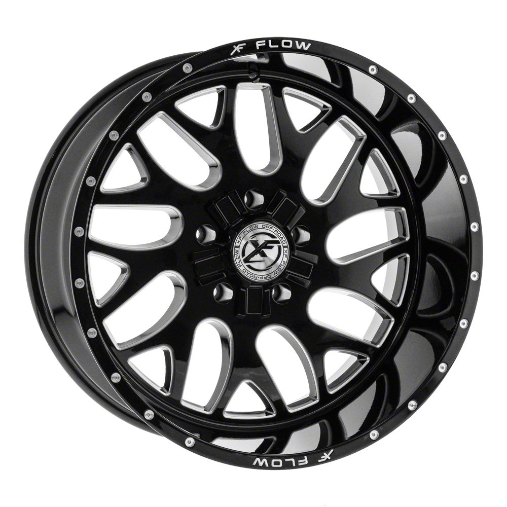 This 20x10 XFX Flow XFX-301 Gloss Black and Milled 6-Lug Wheel; 20x10; -24mm Offset is completed in a high-quality gloss black finish with steel milled accents that will make everyone take notice. For added looks and strength, the wheel features a durable clear coat that withstands the rigors of daily driving.