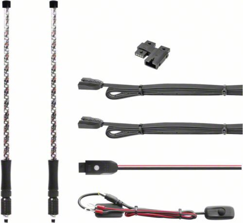 Construction and Appearance. Measuring 32 inches long, these LED whips feature a spring-loaded base for enhanced durability. They are designed for universal applications and are controlled via the XKchrome smartphone app, allowing for easy customization and control.