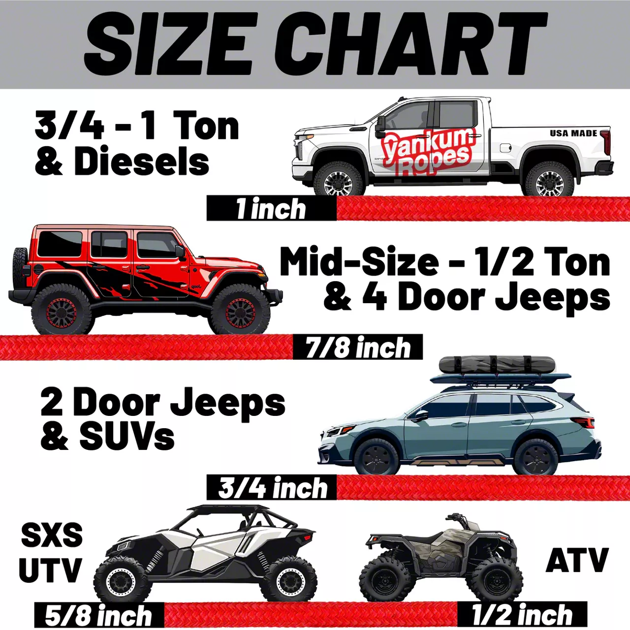 For Effortless Recovery. Introducing the Yankum Ropes 3/4-Inch x 30-Foot Kinetic Recovery Rope - your ultimate off-road companion. This rugged rope is meticulously crafted to provide you with the power of momentum when you need it most. With a size of 3/4 inches by 30 feet, it's designed to deliver that extra linear force required for seamless vehicle recovery. Thanks to its built-in kinetic energy, this rope is primed for action. It stretches and performs with precision, ensuring a safe and efficient recovery every time.