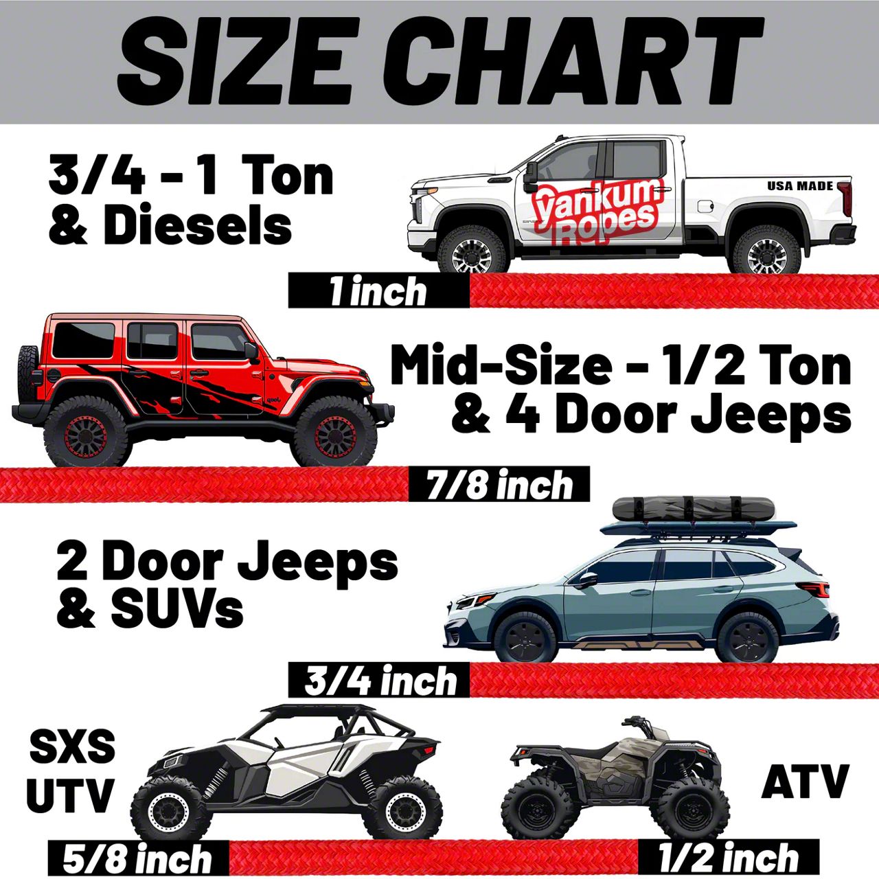Reliable Recovery. The Yankum Ropes Kinetic Rope is a powerful tool designed for the recovery of vehicles weighing between 1,400 to 2,999 pounds. With a breaking strength of 14,800 pounds and its racing red finish, this rope is not only visually striking but also provides superior performance. Its length of 20 feet offers ample distance for safe and effective vehicle recovery operations.