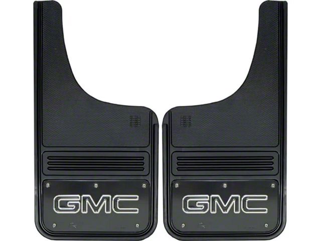 Application. The 12-Inch x 23-Inch Mud Flaps with Black GMC Logo are universal and may require adaptation for certain vehicles.