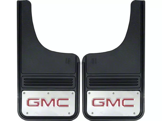 Application. The 12-Inch x 23-Inch Mud Flaps with Red GMC Logo offer universal fitment.