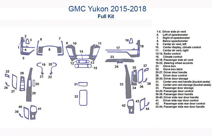 Application. This Full Dash Trim Kit fits all 2015-2018 GMC Yukon models.