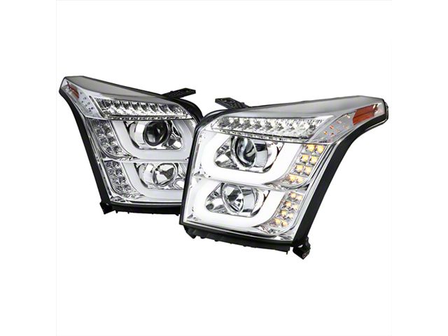 Direct Replacement. Made for the GMC Yukon with factory halogen headlights, these Projector Headlights come in pairs with a polished chrome finish and clear lenses. Built by ISO-certified manufacturers to meet OEM requirements, these lights use H1 12-volt 55-watt high and H11 12-volt 55-watt low beams alongside a LED U-bar, turn signals, and parking lights.