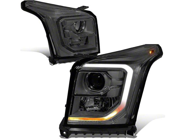 Direct Replacement. Made for the GMC Yukon models with factory halogen headlights, these Projector Headlights come with polished chrome finish housing and tinted black smoked lenses. Coming in pairs, these headlights have built-in LED DRLs, turn signal, and side marker lights, and use 9005 bulbs for their high and H11 low beams. These headlights are direct replacements for interchange part numbers 23342009, 23387147, 23445461, 23342010, 23387148, and 23445462 and GM part numbers GM2502409 and GM2503409.