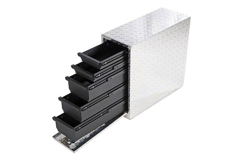 Easy Organizing with Drawers.Elevate your vehicle's storage capabilities with this Wheel Well Toolbox, distinguished by its polished chrome finish and outfitted with 5 matte black finish drawers. This setup facilitates effortless organization, allowing for tidy storage of tools and accessories. Constructed from heavy gauge Brite-Tread aluminum, the toolbox merges robust durability with a stylish design, ensuring a long-lasting solution for keeping your essentials systematically arranged and accessible.