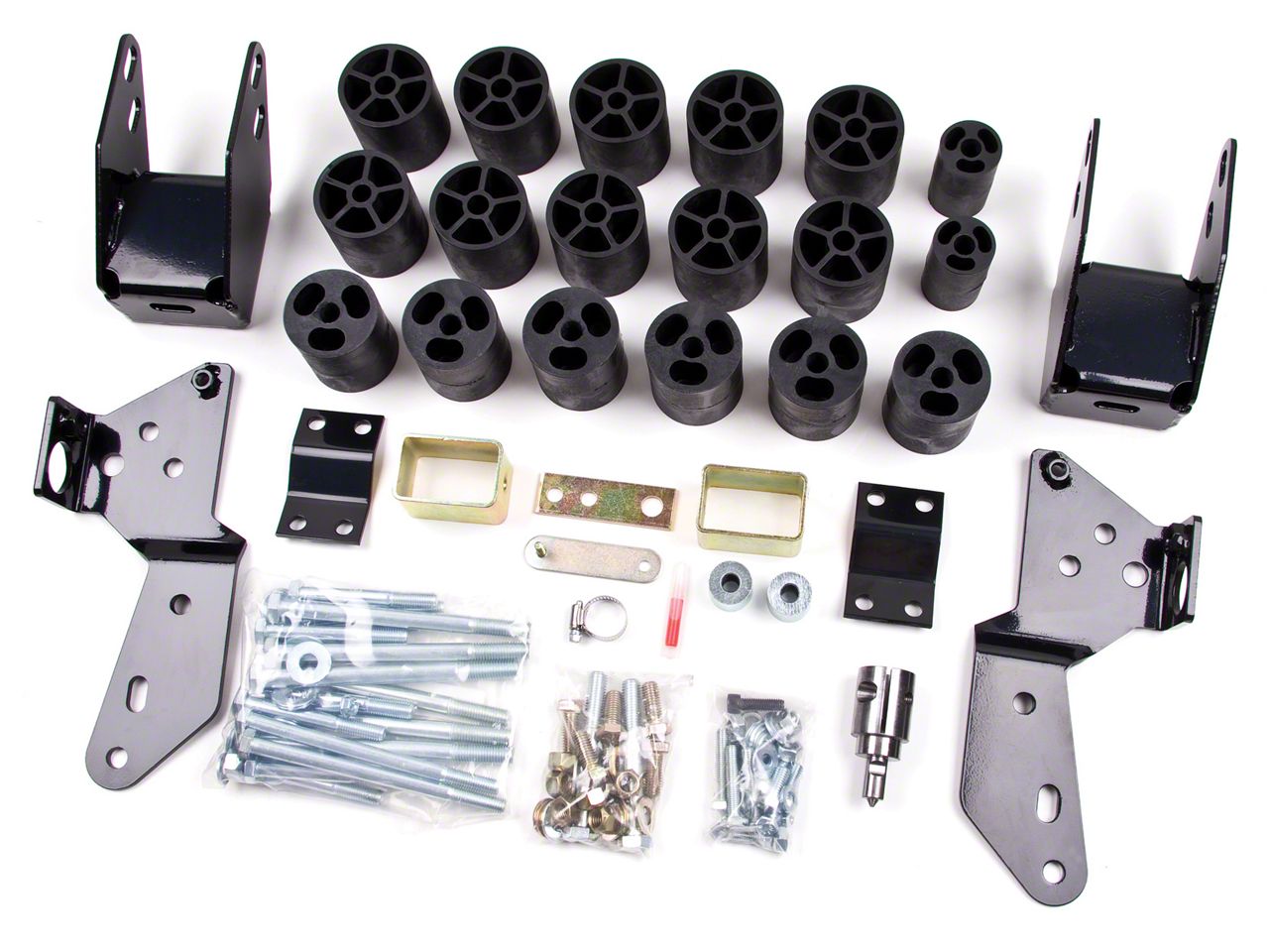 Quality Construction. Zone Offroad designed this 3" Body Lift with the grueling conditions of the trails in mind. The package features heavy-duty indestructible body blocks, complete with a rugged black powder coat finish to increase its resilience to stress and corrosion. The included hardware is finished with a stainless polish that further increases resistance to rust.