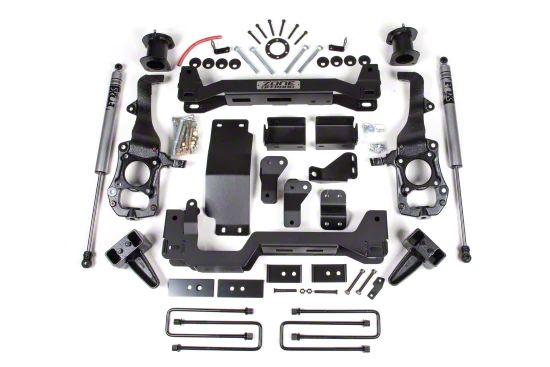 Full Lift Kit. Made for the Ford F-150, this Zone Offroad Suspension Lift Kit is a full lift kit that provides a front lift of 6 inches and a rear lift of 4 inches. Crafted from premium parts, this kit includes crossmembers, steering knuckles, strut spacers, rear blocks, and brake line brackets for a complete and hassle-free installation.