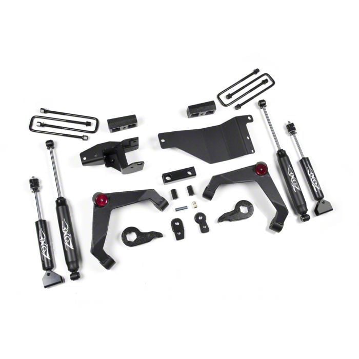 The Rest of the Kit. This Zone Offroad 3-Inch Adventure Series Upper Control Arm Suspension Lift Kit with Nitro Shocks comes with front differential relocation brackets to correct the CV axle operating angle. Sway bar relocation bracket keep clearance, while 2-inch rear lift blocks and U-bolts level the stance. A skid plate is supplied as well.