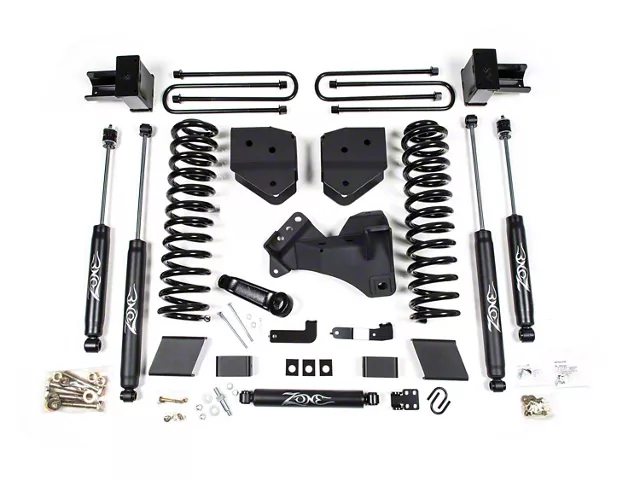 Tough Off-Road Design. Prepare for more exciting drives in your F-250 with this Zone Offroad 4-Inch Suspension Lift Kit with Nitro Shocks to boost your game. Designed to handle tough terrain and mange larger tires, it lifts your vehicle by 4 inches and features heavy duty coil springs and lifts blocks or optimal support and drive dampening.