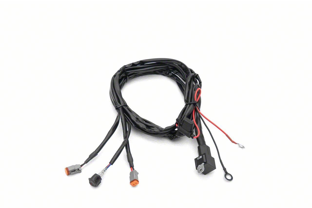 Plug and Play wire harness for LED Light Bars. Includes On and Off switch with LED indicator, OEM automotive grade waterproof connectors, fuse and automotive relay with solderless spade connections.